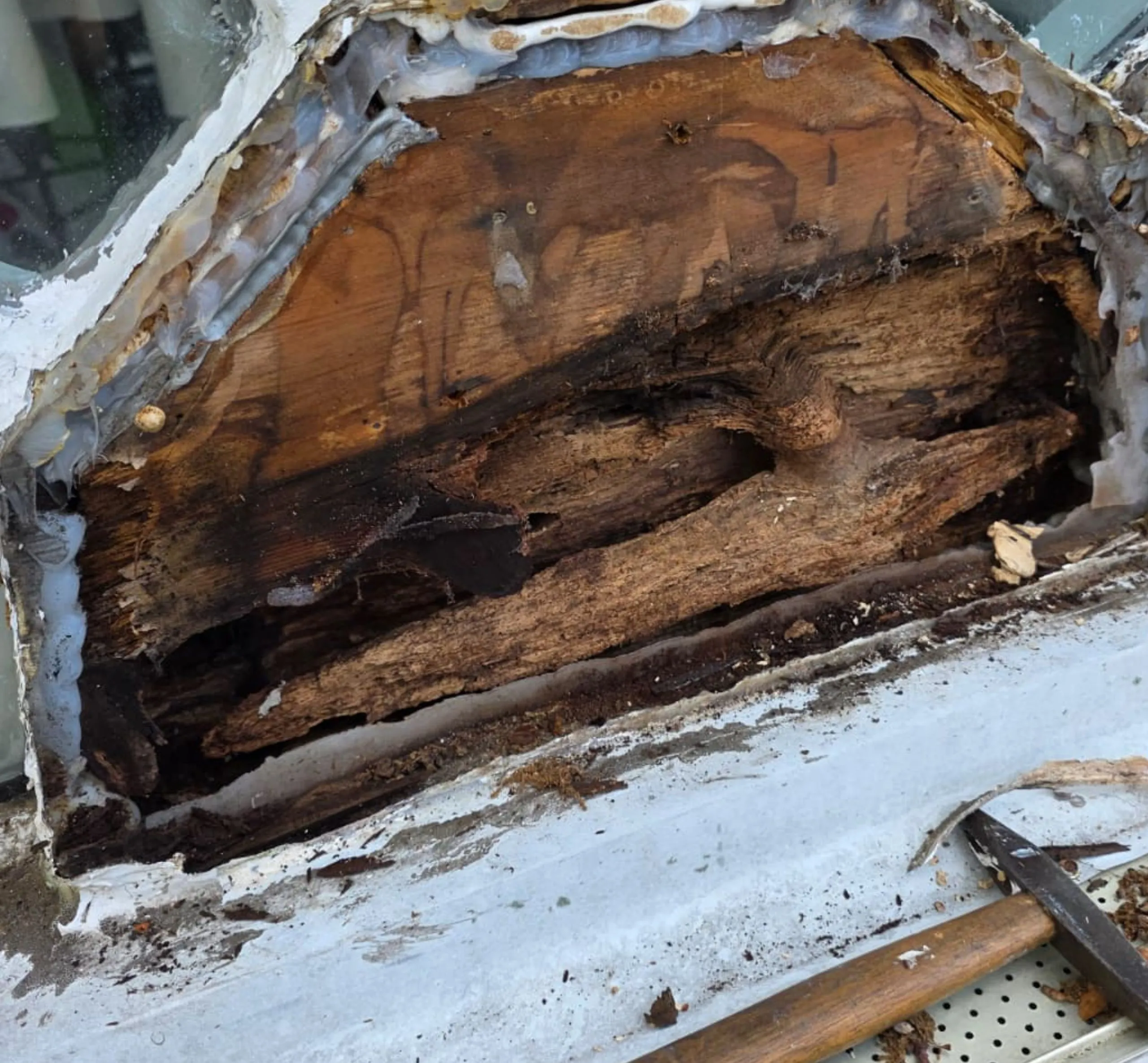 Upon initial inspection, it was evident that water infiltration had damaged the load-bearing section of the window’s base. Years of exposure, failed caulking, and trapped moisture had caused the wood to deteriorate entirely beneath the paint. We began by carefully disassembling the base mullion, removing all rotted wood while preserving the glass panes and surrounding trim. Every step was taken with precision to ensure the structure retained its original design integrity.