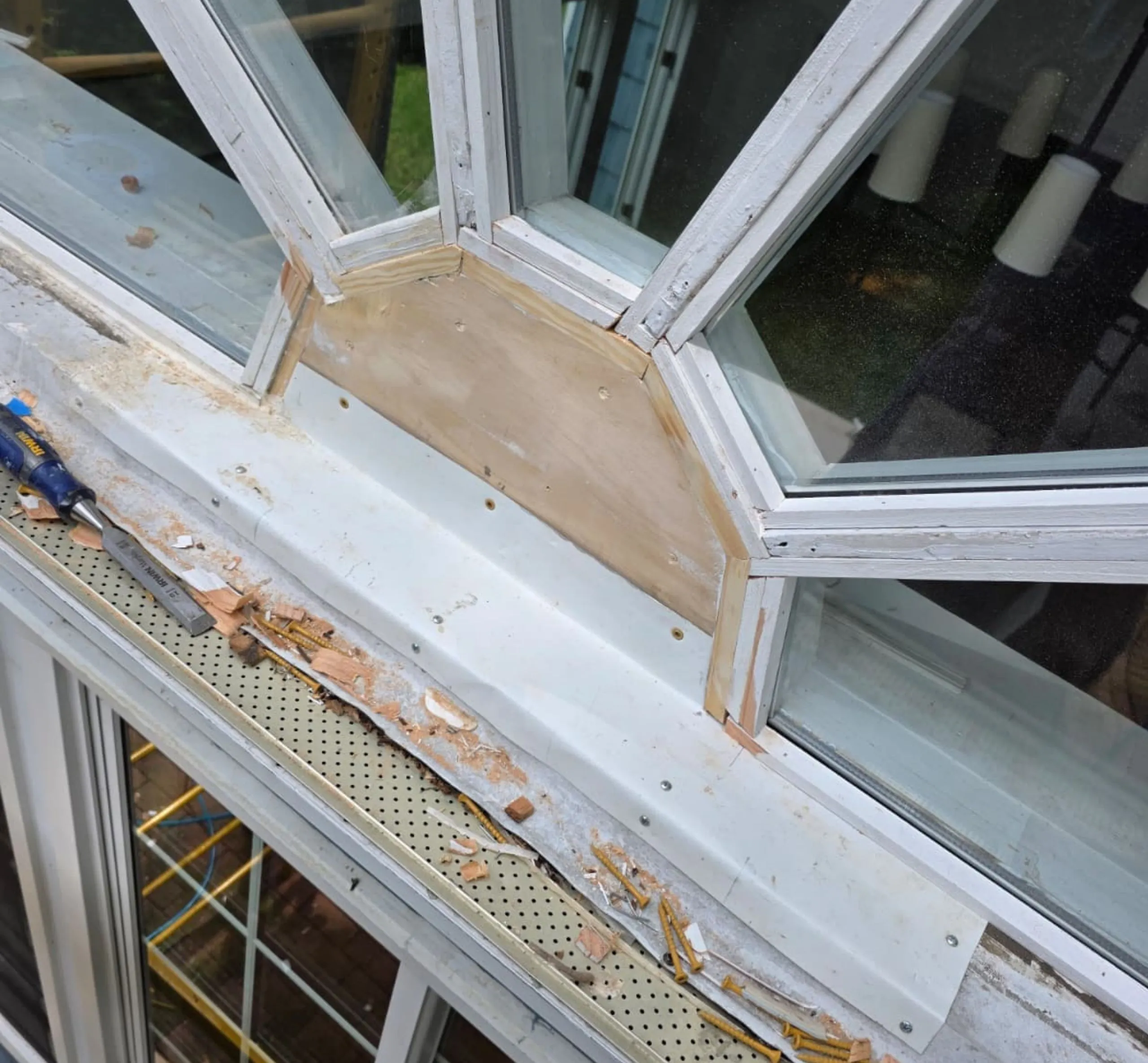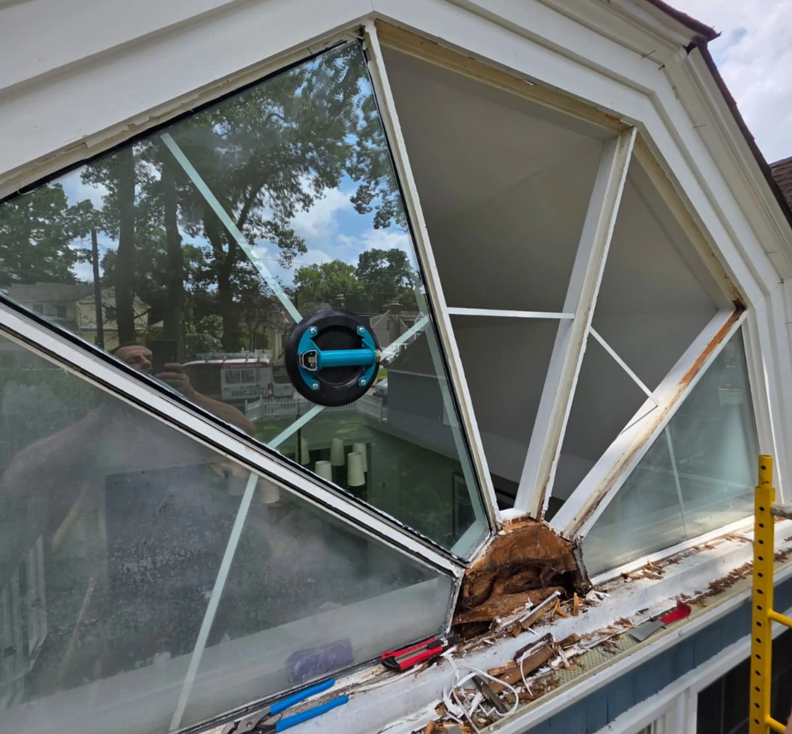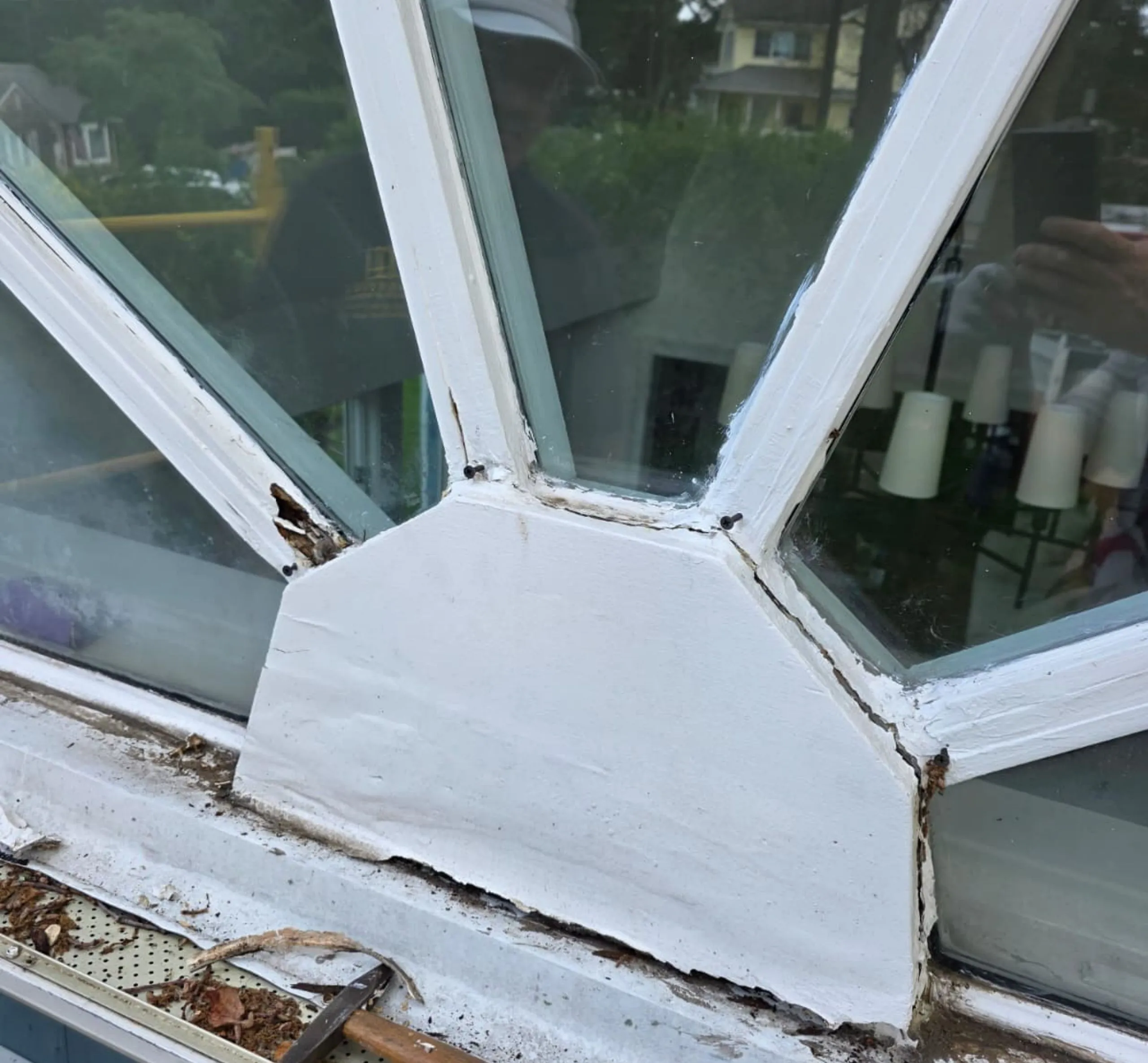 At Prestige Window Works, we recently completed a highly specialized custom wood window repair in North Haven, NY. The homeowner contacted us after discovering severe rot in a uniquely designed arched multi-pane window. This custom configuration, featuring triangular glass segments fanned out from a center panel, was not something just any contractor could handle. It required detailed knowledge of both structural wood repair and custom window replication — something we’ve mastered over years of restoring complex architectural woodwork across Long Island.