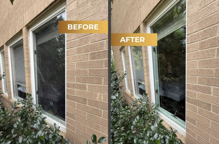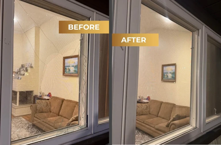 Look at the before-and-after of our Window Glass Replacement in Holbrook, NY — a large damaged panel rebuilt with precision.